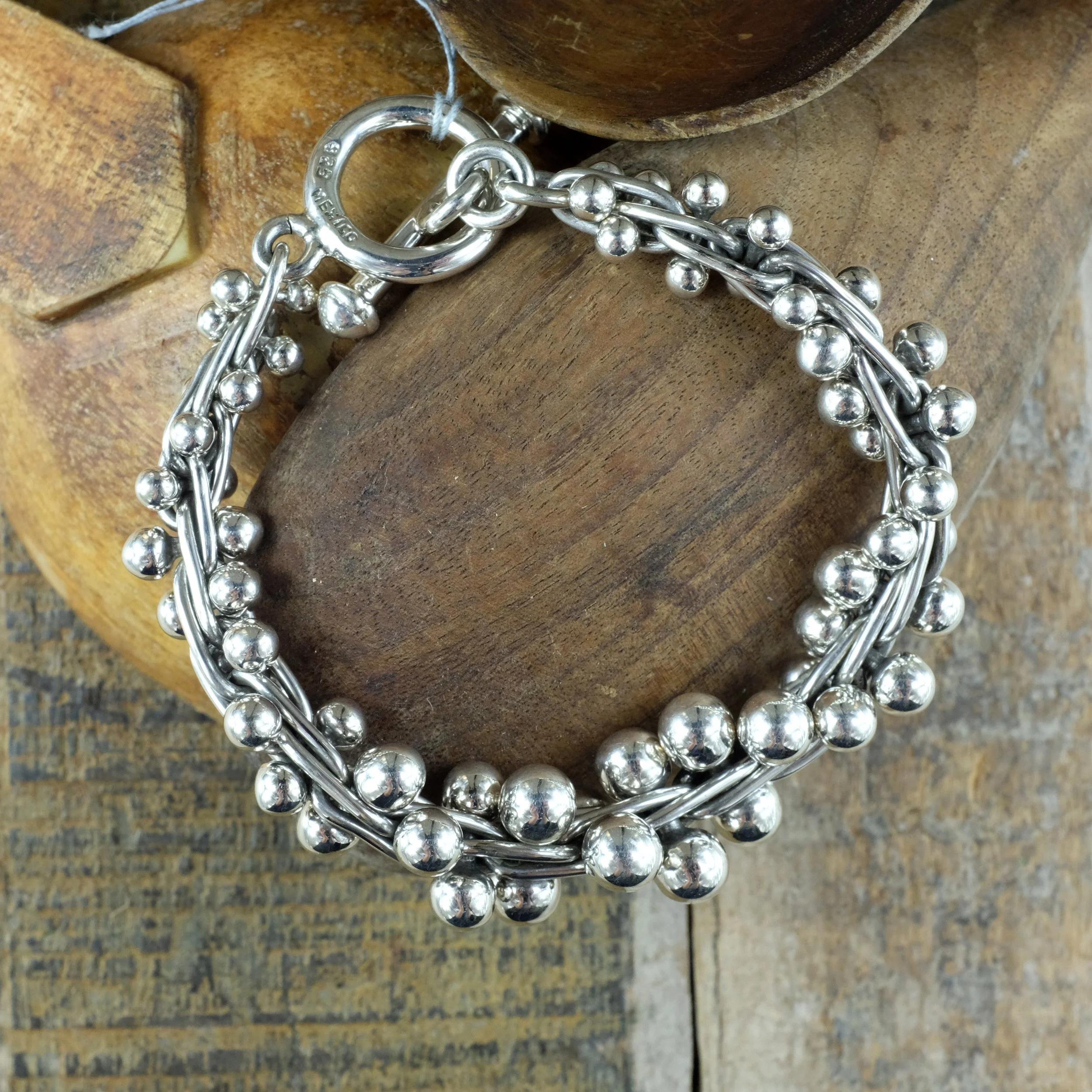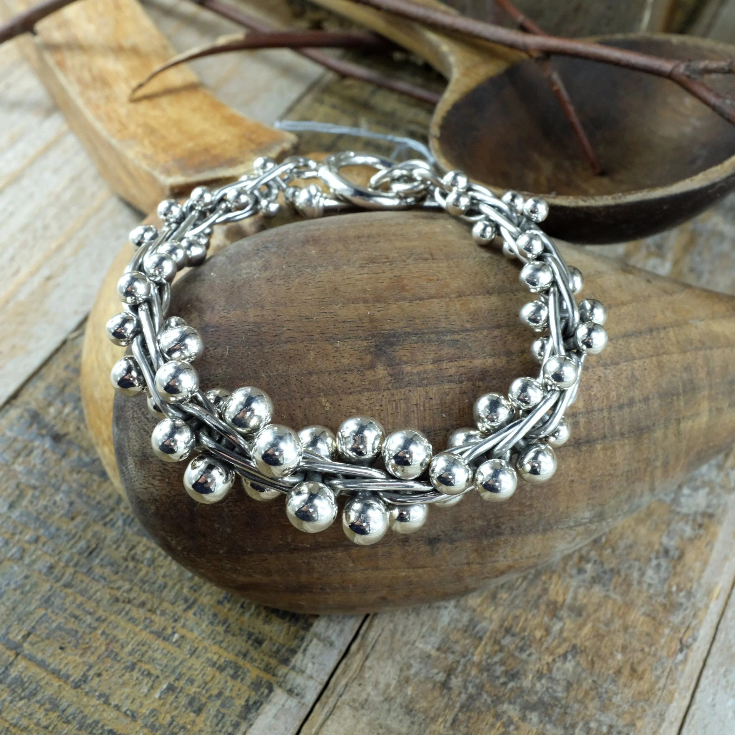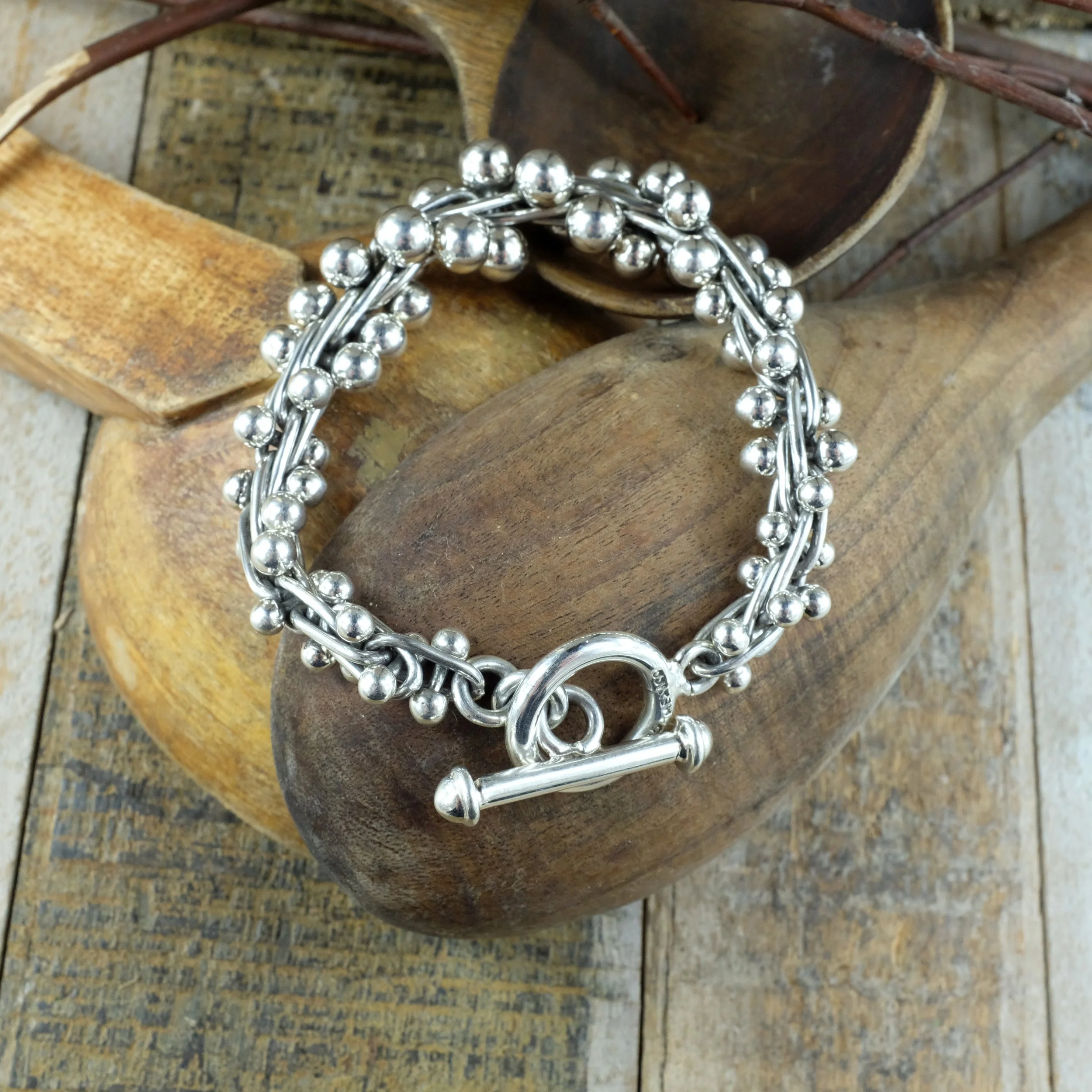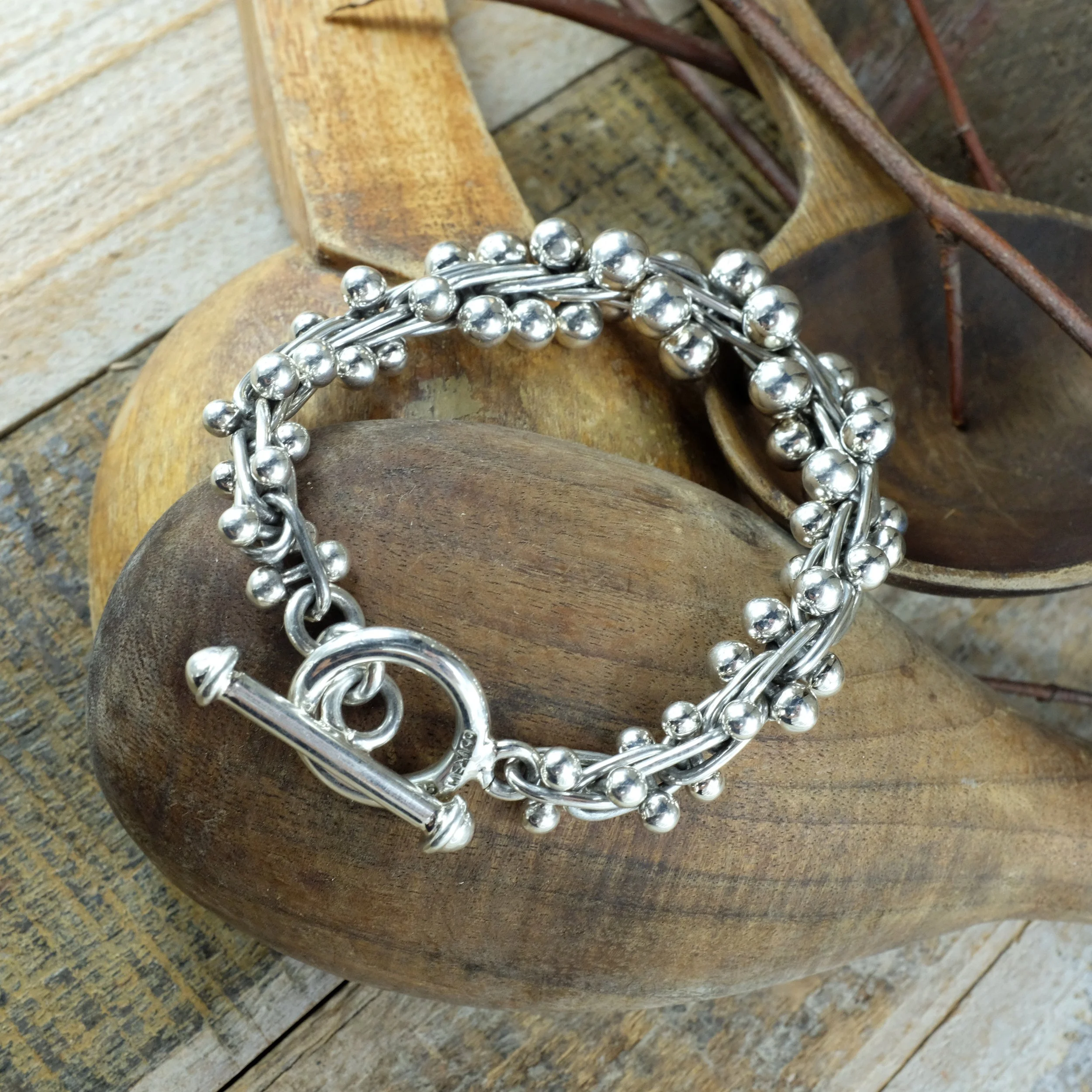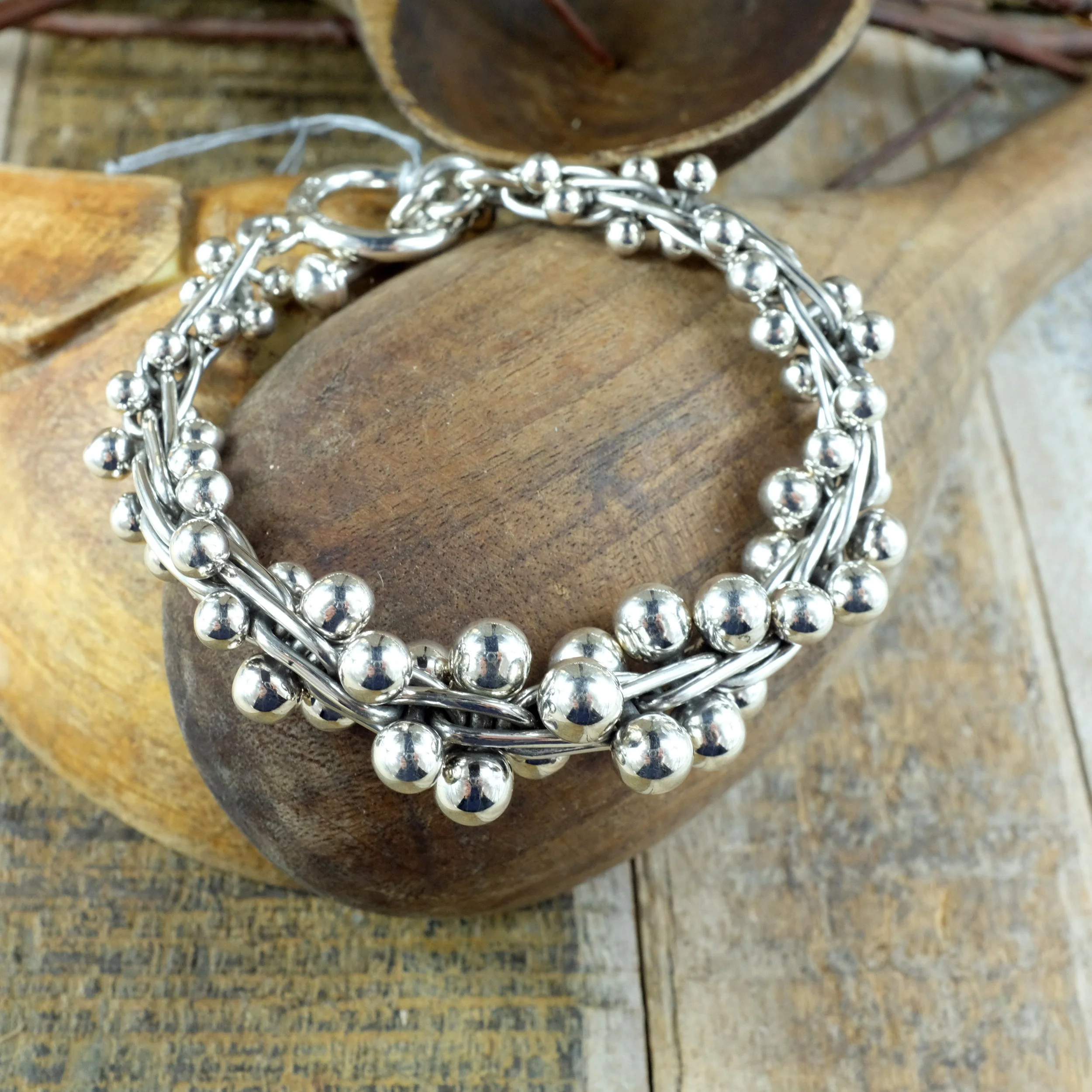 A solid silver chain with interlinked balls with some oxidised silver to give the bracelet more depth. Nice chunky silver bracelet, this version has different sized balls which are bigger at the middle of the bracelet.